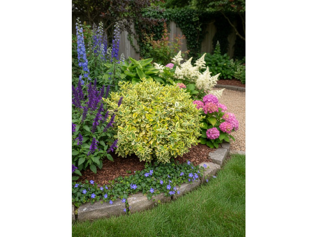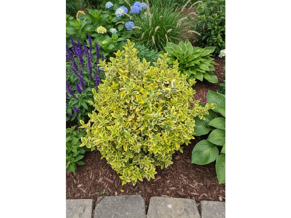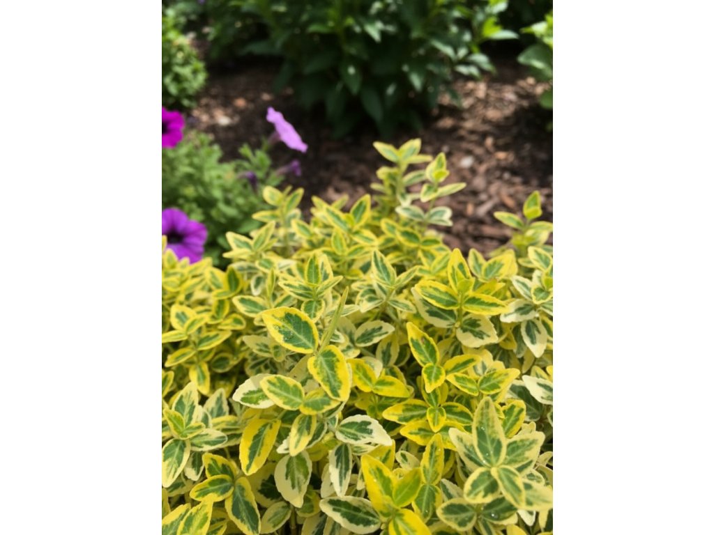 Korčuľ japonský 'Ovatus Aureus' (Euonymus Japonicus Ovatus Aureus).Vďaka výraznému panašovaniu pôsobí sviežo a rozjasňuje záhradu po celý rok. Skvele sa hodí do moderných aj klasických výsadieb, ako solitéra, do skupín aj nízkych živých plotov, prípadne na pestovanie v nádobách.