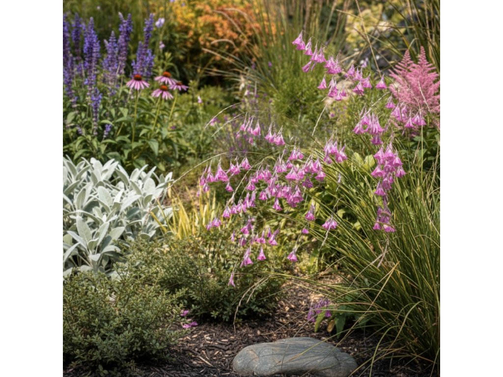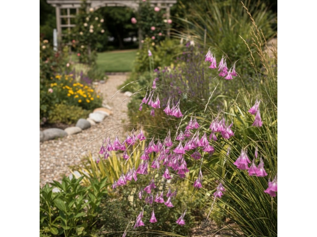Dierama pendulum, známa tiež ako „anjelské prúty,“ je očarujúca trvalka s jemne ružovými kvetmi na dlhých, previsnutých stonkách. Táto elegantná rastlina pôvodom z Južnej Afriky dodáva záhradám romantický nádych a prirodzený pohyb, keď jej kvety ladne tancujú vo vetre. Kvitne od júla do augusta a je ideálna pre prírodné záhrady, zmiešané záhony alebo ako solitér v blízkosti vodných plôch.