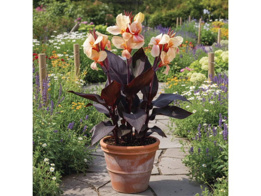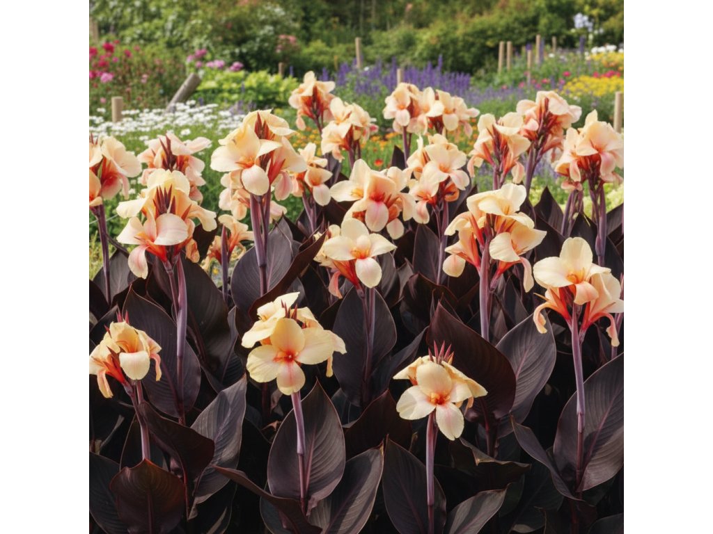 Kana 'Madame Angel Martin' (Canna 'Madame Angel Martin') vnesie do vašej záhrady dotyk trópov. Jej broskyňovo ružové kvety nádherne kontrastujú s tmavo vínovými listami. Spoločne vytvárajú výrazný, pritom elegantný efekt. Rastlina dorastá do výšky okolo 70–100 cm a kvitne od júla až do septembra. Skvele sa hodí do záhonov aj väčších nádob. Kvety je možné využiť aj na rez do vázy.