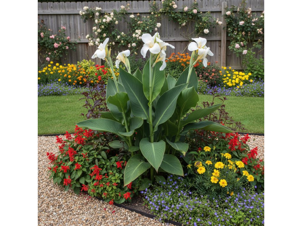 Dosna 'Vanilla Cream' (Canna) sa vyznačuje jemnými, krémovo žltými kvetmi, ktoré dodávajú záhrade romantický a elegantný vzhľad. Svieže zelené olistenie dokonale ladí s kvetinami a vytvára harmonický celok, ktorý vynikne v každom záhone alebo nádobe.