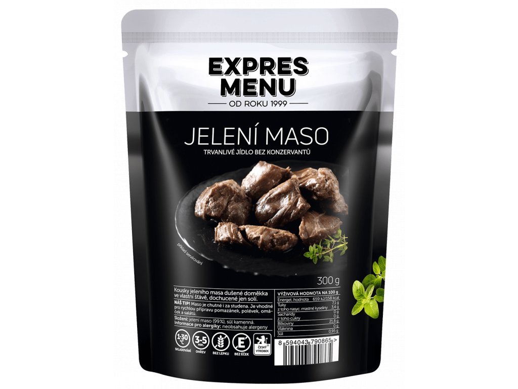 Kousky jeleního masa dušené doměkka ve vlastní šťávě, dochucené jen solí.