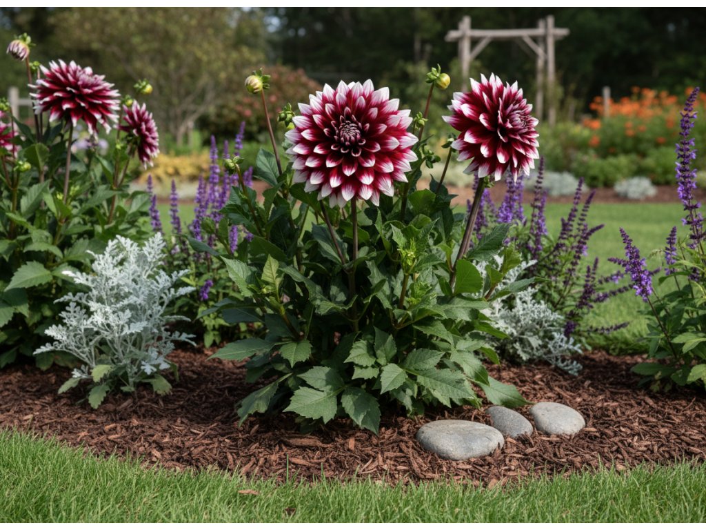 Georgína (Dahlia) Mystery day prináša svojimi dvojitými kvetmi s tmavo vínovými okvetnými lístkami s bielymi okrajmi magický zážitok pre každého obdivovateľa. Kvety dorastajú do priemeru až 25 vm a majú mierne zaoblené okraje okvetných lístkov.
