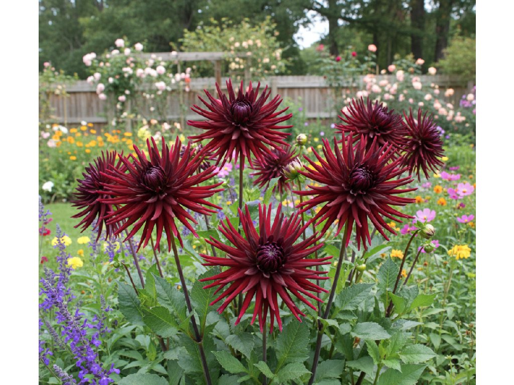 Georgína'Nuit D'été' (Dahlia 'Nuit D'été') ozdobí vašu záhradu temne vínovými kvetmi. Svojím kaktusovitým tvarom pripomínajú hodvábne plamene. Štíhle, špicaté okvetné lístky dodávajú kvetom dramatický a elegantný vzhľad. Okamžite vás upútajú.Jiřina dorastá do výšky až 120 cm, a preto skvele vynikne ako solitér aj v kombinácii s nižšími rastlinami. Kvitne bohato od júla do jesene a je obľúbená aj medzi opeľovačmi.
