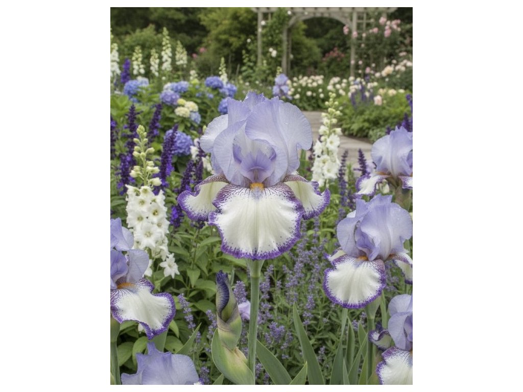 Kosatec Germanica 'On Edge' má nádherný trojfarebný kvet. Horné okvetné lístky sú levanduľovej farby, spodné majú čisto biely základ s sýto fialovým lemovaním. Jeho listy sú mečovité svetlo zelenej farby s modrošedým nádychom.