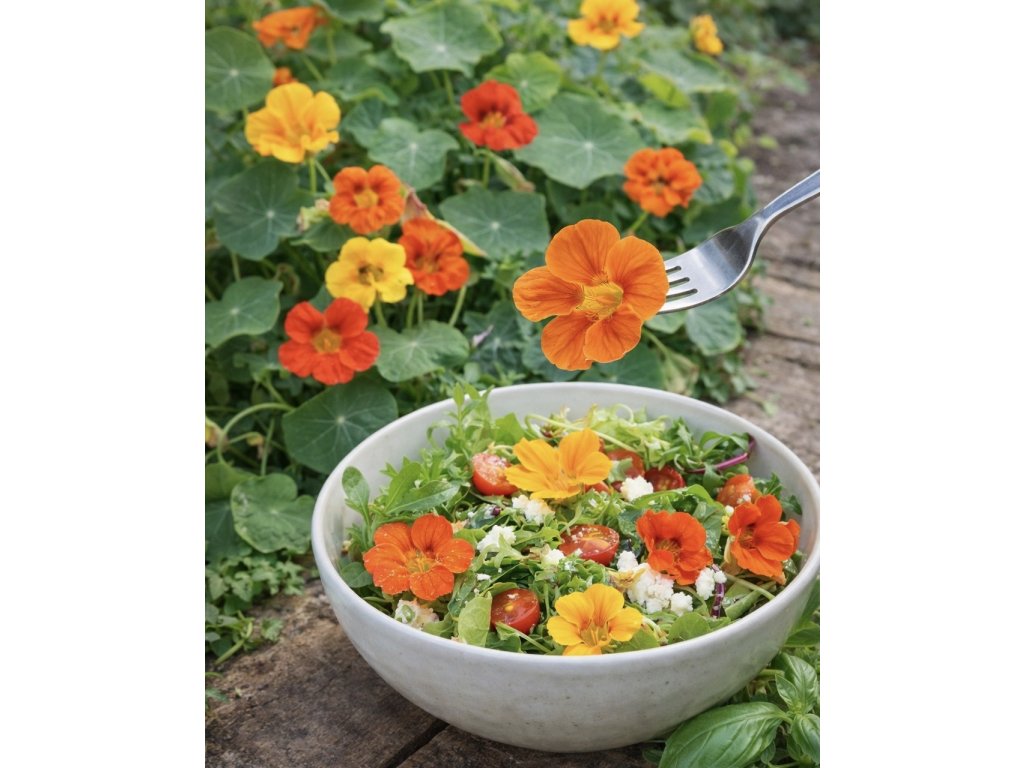 Kapucínka väčšia - kolekcia JEDLEJ KVETY - kvety v zmesi farieb od krémovo bielej, cez žltú, oranžovú až po jasne červenú, patria medzi najpopulárnejšie jedlé kvety. Majú výrazne pikantnú žeruchovú chuť a vynikajú ako ozdoba zeleninových šalátov.