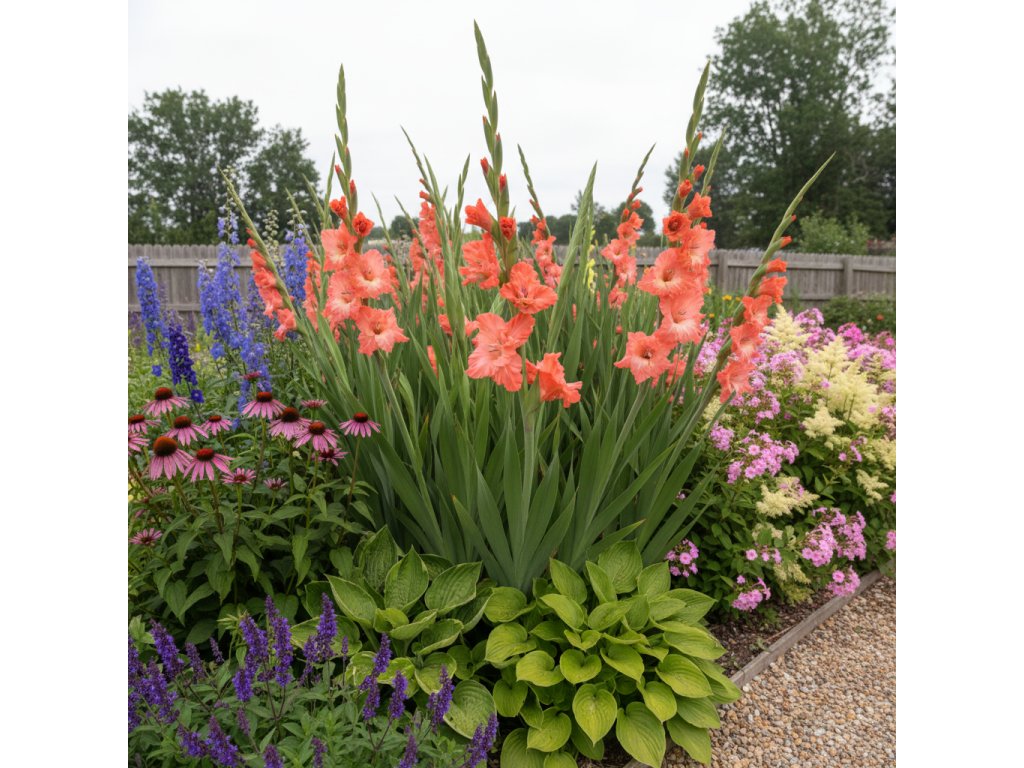 Mečík Ted's Frizzle (Gladiolus hybridus Ted Frizzle) v záhrade neprehliadnete. Poteší vás výrazne zvlnenými, kučeravými kvetmi, ktoré pripomínajú elegantnú čipku. Ich koralovo ružová farba s tmavšími okrajmi vytvára bohatý a luxusný efekt. Kvety sú usporiadané na pevných, vzpriamených stonkách a rozkvitajú postupne, čo predlžuje dobu kvitnutia. Vďaka svojmu originálnemu vzhľadu sa skvele hodí ako solitéra aj do výrazných letných kytíc a floristických aranžmánov.