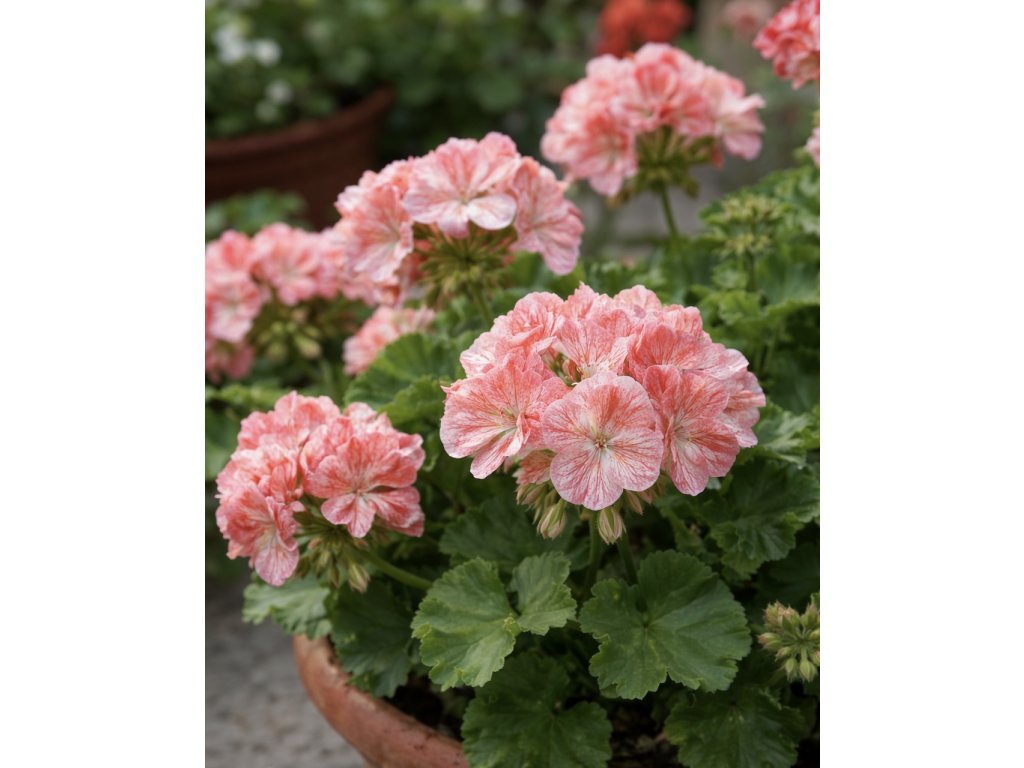 Odroda s atraktívnymi súkvetiami purpurovo striekaných kvetov na svetlom podklade. Listy sú tmavo zelené ako u klasických červených odrôd, bez žíhania. Obľúbená trvalka pestovaná ako letnička, výška 35cm. Rastliny s okrúhlym listom s charakteristickým prúžkom. Uplatní sa ako balkónová rastlina na pestovanie v nádobách, okenných kvetináčoch aj na výsadbu na záhony. Vyžaduje slnečné stanovište a prevzdušnenú neutrálnu až zásaditú pôdu. Predpestovanie je časovo náročné, trvá približne 4 mesiace. Vysievame do preparenej, štruktúrnej zeminy a jemne zasypeme. Zaistíme odporúčanú teplotu a po vyklíčení dostatok svetla. Prepichujeme 3-4 týždne po výseve. Následne rozsadíme jednotlivé rastliny do kvetináčov. V priebehu vegetácie prihnojujeme a odstraňujeme uvädnuté kvety. Na bohaté kvitnutie potrebujú slnko a teplo. Prezimuje na svetlom mieste pri teplote min. 5-10°C