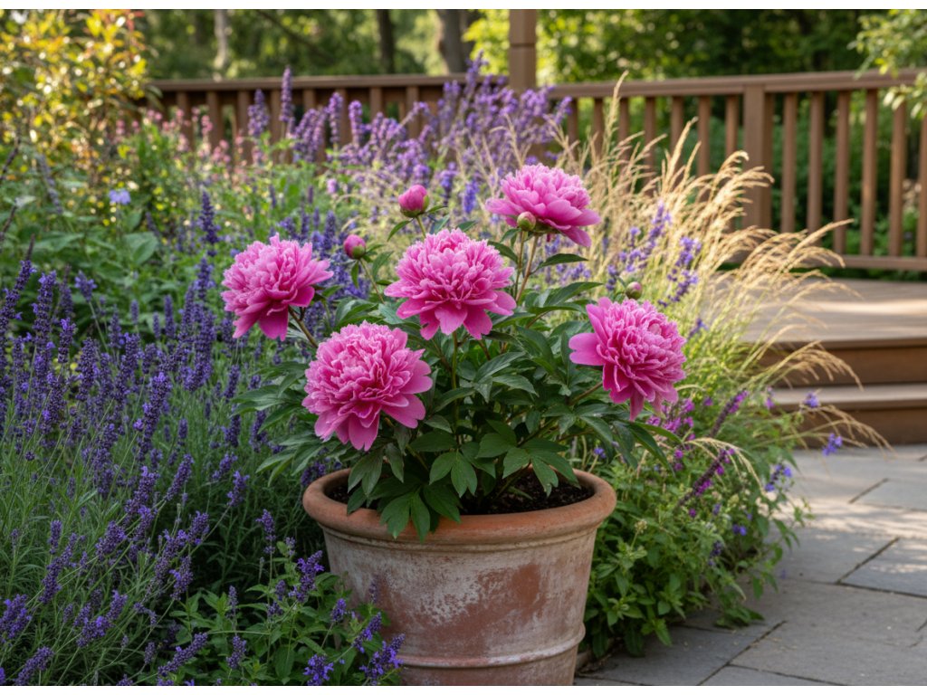 Pivonka 'Pink Double Dandy' v kvetináči
