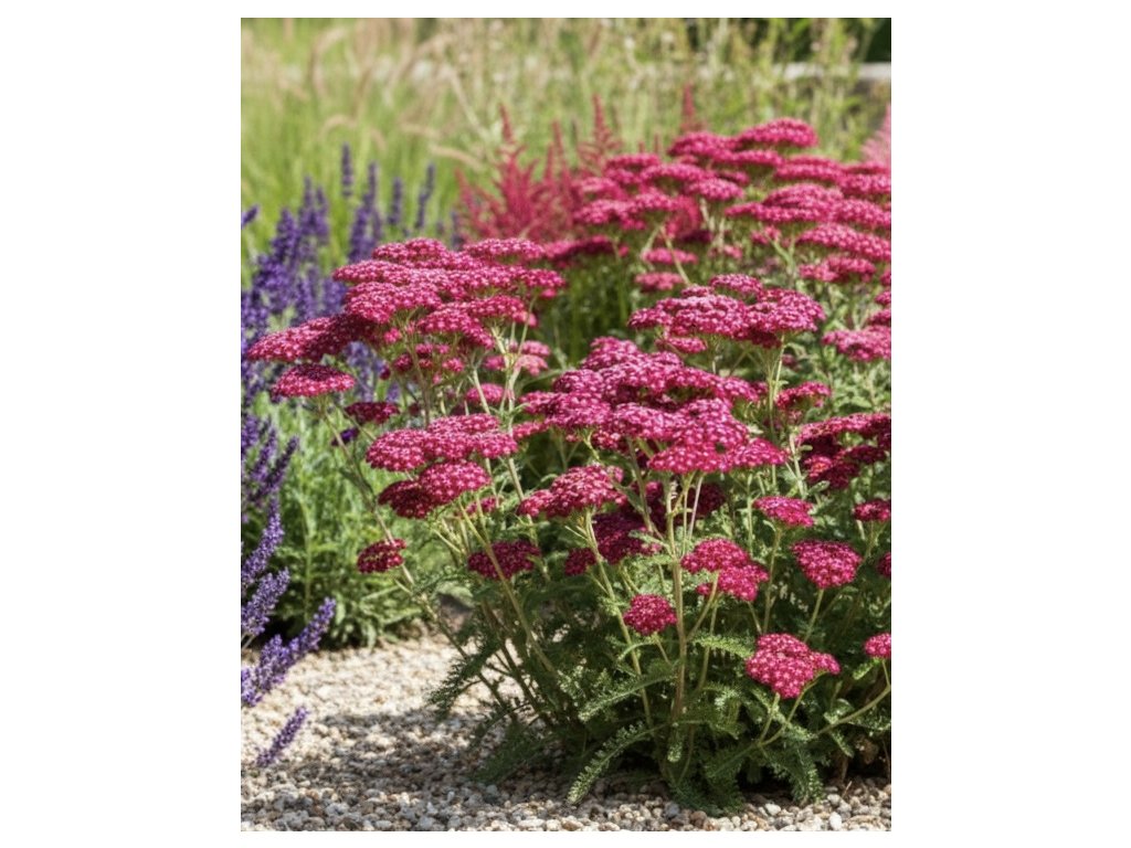Rebríček obyčajný 'Summerwine' (Achillea millefolium) je pôvabná trvalka s bohatými, sýto ružovými kvetenstvami, ktorá rozjasní záhony od začiatku leta až do jesene. Jeho jemne sperené listy dodávajú rastline vzdušný a dekoratívny vzhľad, zatiaľ čo drobné kvety vytvárajú husté plochy živej farby, ktoré lákajú včely, motýle a ďalšie opeľovače.
