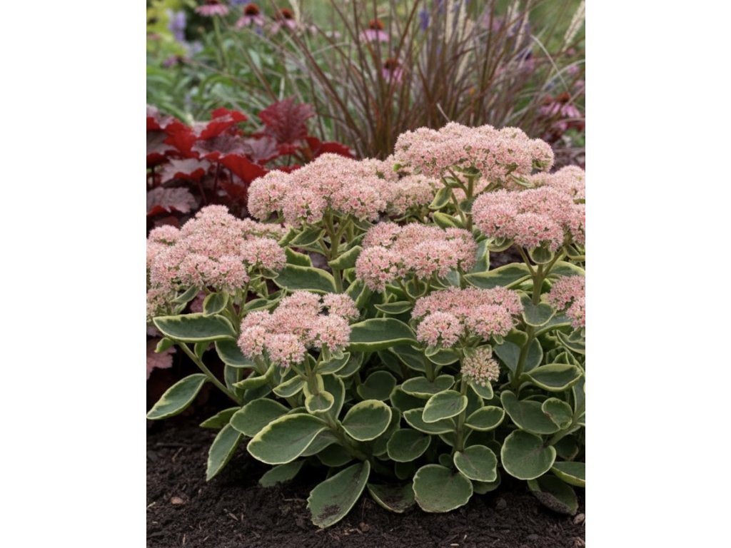Rozchodník 'Diamond Edge' (Sedum telephium) je atraktívna trvalka s nápadnými zelenými listami s krémovým lemom a jemnými ružovými kvetmi. Kvitne od augusta do októbra a dorastá do výšky 40-50 cm. Tvoria kompaktné trsy, ktoré vyniknú v zmiešaných trvalkových záhonoch aj ako solitér.