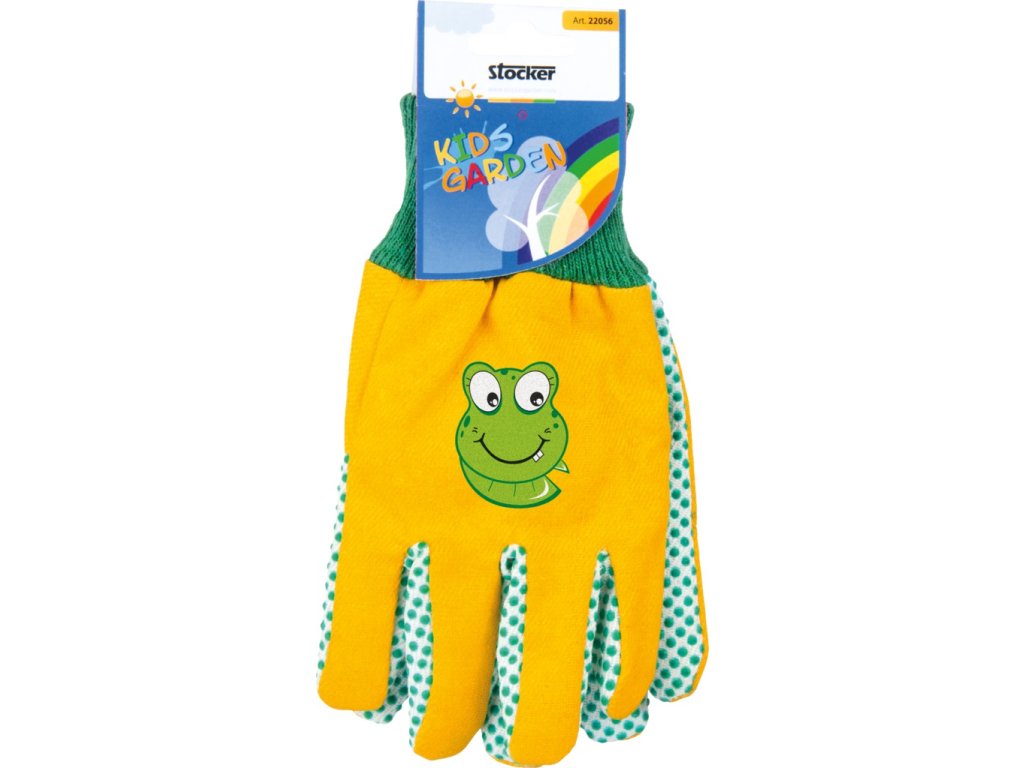 Detské bavlnené pracovné rukavice, dlaňová strana a prsty s terčíkmi z PVC. Farba žltá s obrázkom.