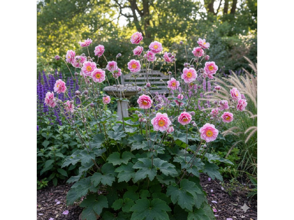 Sasanka japonská 'Königin Charlotte' (Anemone hupehensis 'Königin Charlotte') spestrí záhradu v čase, keď väčšina kvetov už odkvitá. Táto jesenná trvalka rozkvitá od augusta až do októbra na pevných stonkách množstvom svetlo ružových kvetov so žltým stredom. Kvety dosahujú až 7 cm v priemere a sú vhodné aj na rez. Rastlina dorastá do výšky okolo 70–100 cm.