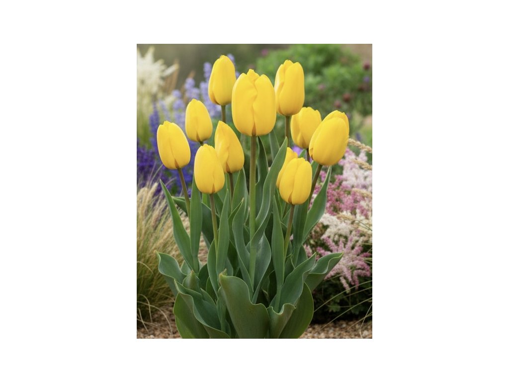 Tulipán (Tulipa) Jan van Nes vyniká sýto žltými oválnymi kvetmi, ktoré rastú na pevných, 40-60 cm vysokých stonkách, odolných voči vetru a dažďu. Vďaka tomu sa stonky nelámu a kvety zostávajú krásne po celú dobu kvitnutia. Šedo-zelené, mečovité listy vytvárajú pri zemi hustú ružicu a pridávajú rastline ďalší estetický rozmer. Nakvitá počas apríla a je tiež ideálny na rez do vázy.