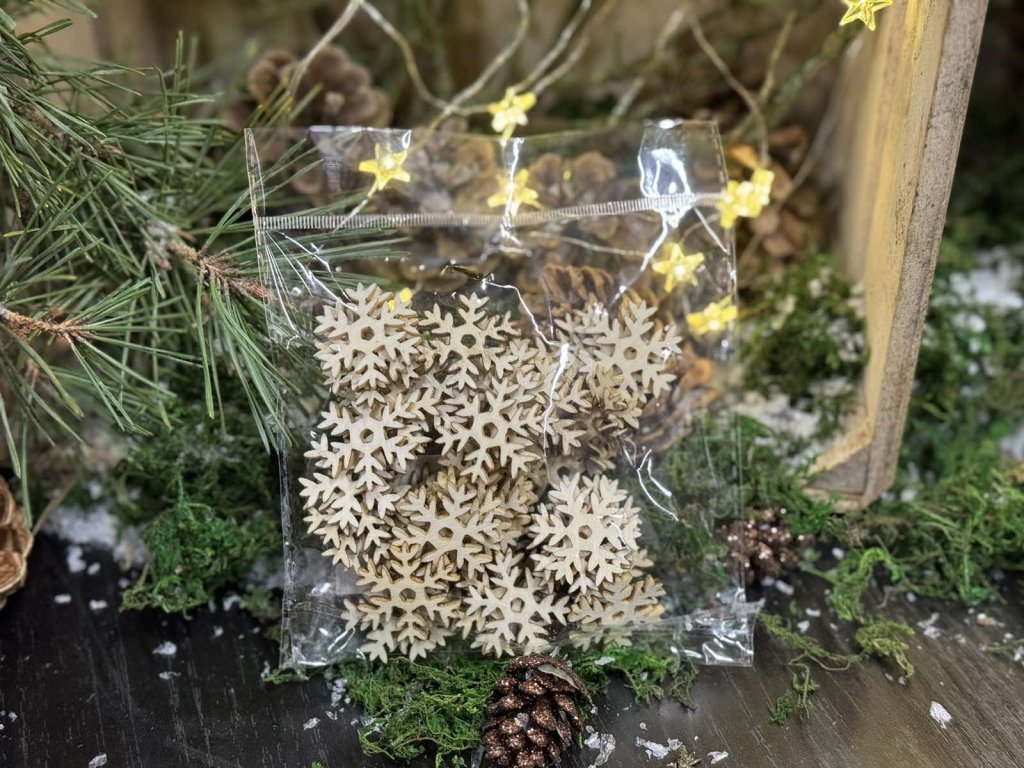 Sada drevených ozdôb v tvare vločiek vynikne v každej zimnej aj vianočnej dekorácii.