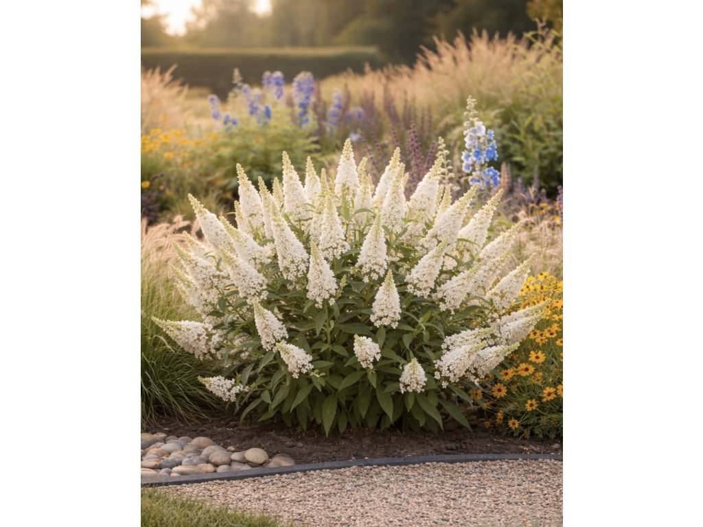 Zakrpatený motýlí ker (Buddleja 'Candy Little White') je kompaktná odroda, ktorá dorastá do výšky iba 60–80 cm, čo ju robí ideálnou voľbou pre malé záhrady, nádoby alebo balkóny. Jeho čisto biele kvety kvitnú od júla do októbra a sú neodolateľné nielen pre ľudské oko, ale aj pre motýle, ktoré ker hojne priťahuje.