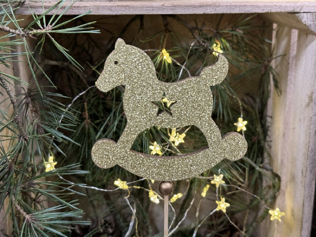 Zapichovacia ozdoba s trblietavým hojdacím koníkom pôsobí veľmi elegantne. Skvele doplnia vaše zimné a vianočné dekorácie. Vhodná na dozdobenie váz, kvetináčov a ďalších dekorácií.
