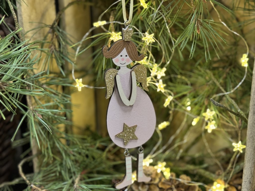 Drevená ozdoba na stromček v tvare anjela s veľmi milou a pôsobivou maľbou.