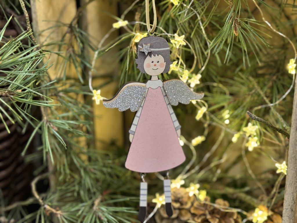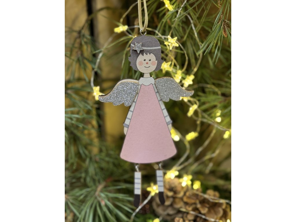 Drevená ozdoba na stromček v podobe anjela s veľmi milou a pôsobivou maľbou a trblietavými krídlami si získa vaše srdce. Anjelik má pohyblivé nožičky.