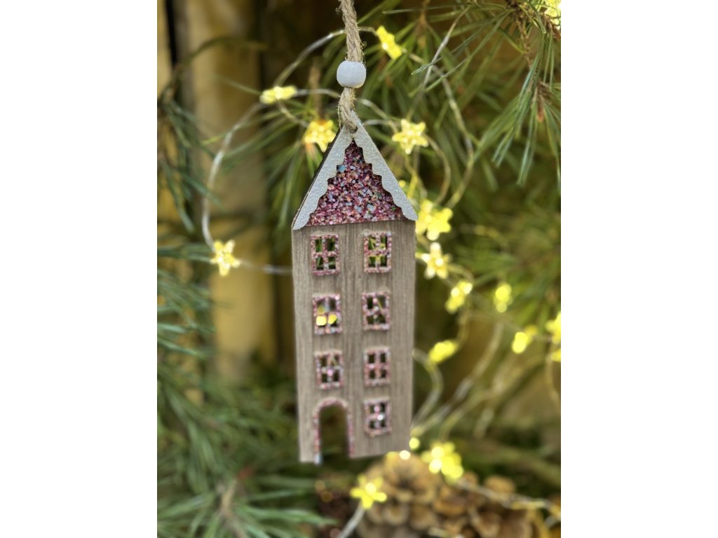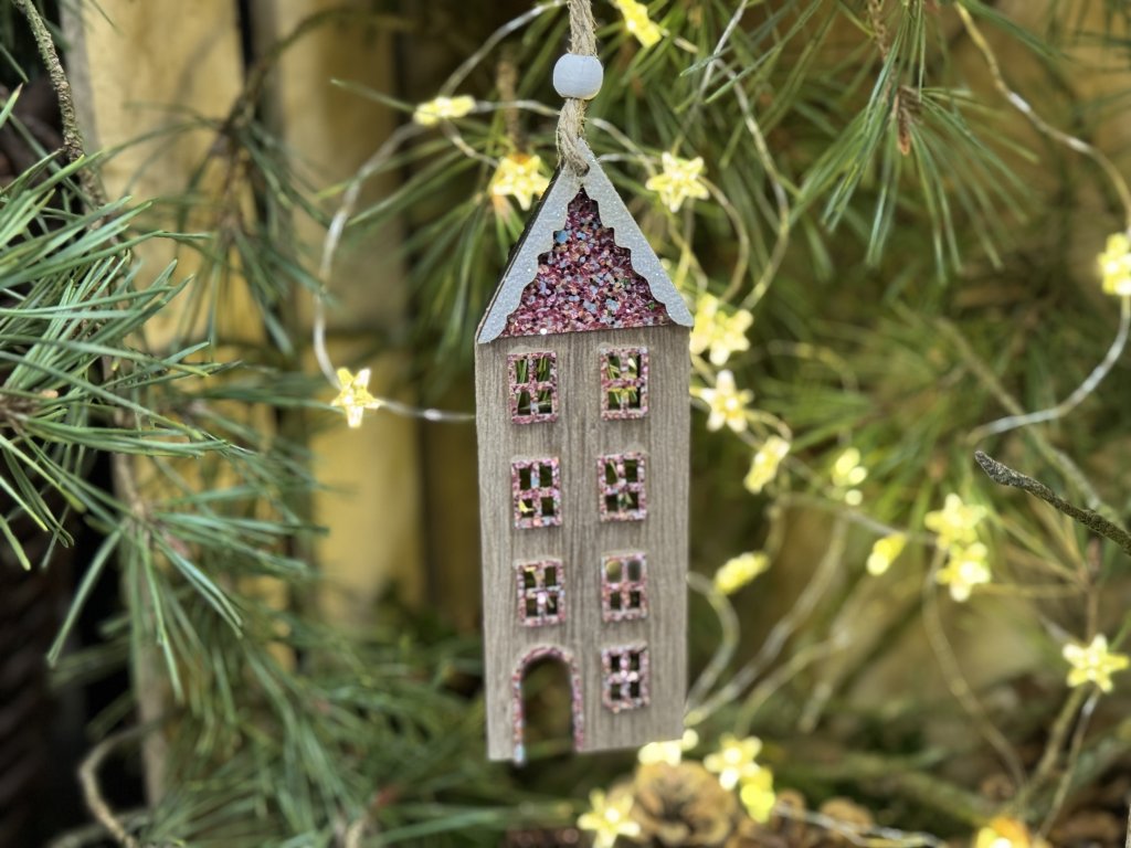 Pridajte na váš vianočný stromček trošku nežnej krásy v podobe tejto jemne krásnej ozdoby z dreva v tvare domčeka.