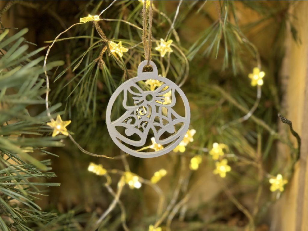 Ozdobte váš domov či stromček do prírodných ozdôb. Pridajte do vašej zbierky nežnú vyrezávanú ozdobu so zvončekmi.