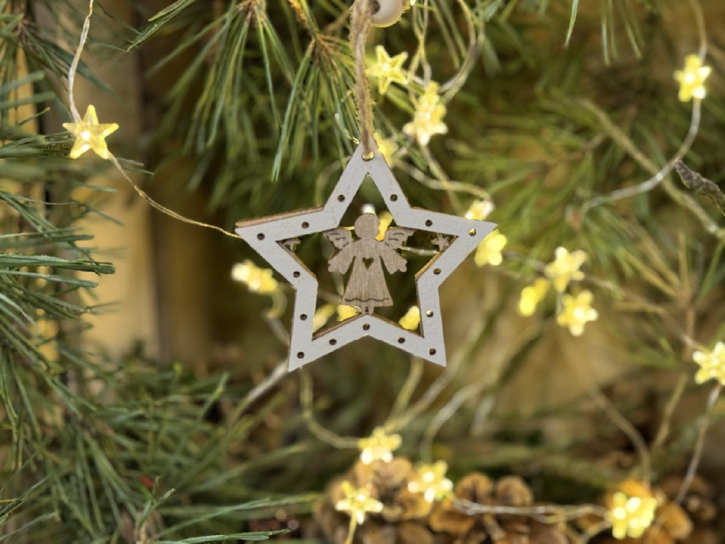 Skrášlite váš domov či stromček s ozdobami v prírodnom štýle. Pridajte do vašej zbierky nežnú vyrezávanú ozdobu v tvare hviezdy s anjelom.