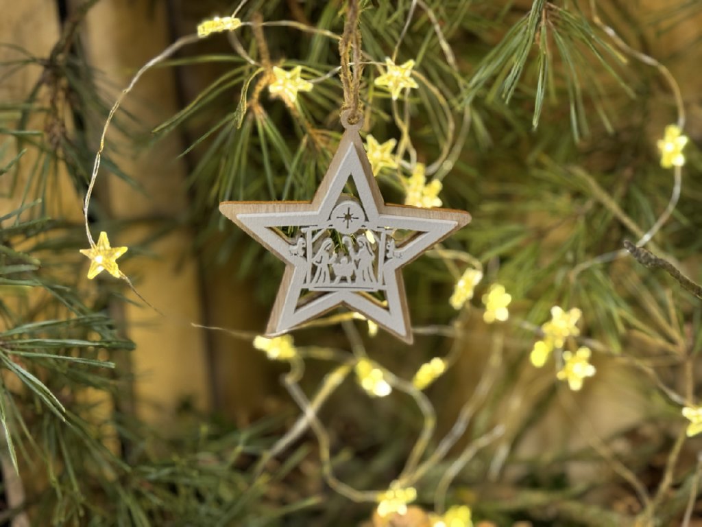 Skrášlite váš domov či stromček s ozdobami v prírodnom štýle. Pridajte do vašej zbierky nežnú vyrezávanú ozdobu v tvare hviezdy s betlehemom.