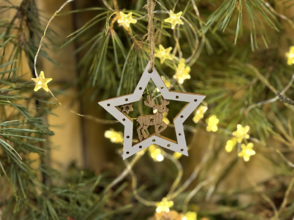 Skrášlite váš domov či stromček s ozdobami v prírodnom štýle. Pridajte do vašej zbierky nežnú vyrezávanú ozdobu v tvare hviezdy s jeleňom.