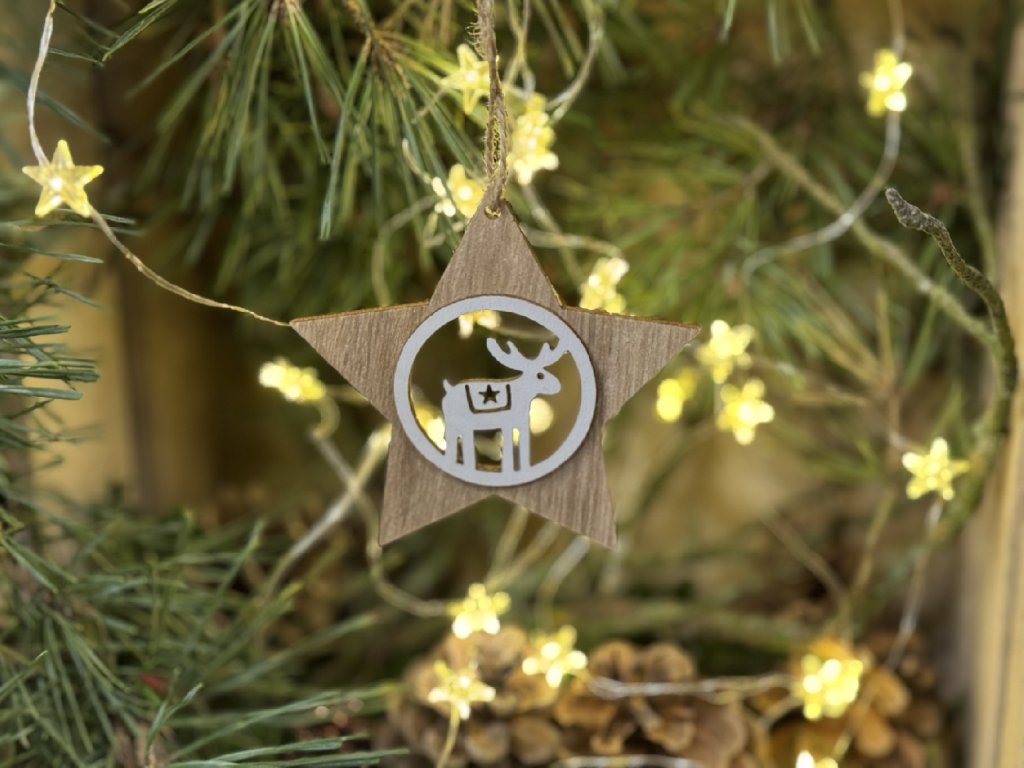 Skrášlite váš domov či stromček s ozdobami v prírodnom štýle. Pridajte do vašej zbierky nežnú vyrezávanú ozdôbku v tvare hviezdy so sobom.